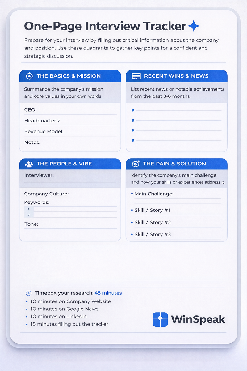 That's exactly why I created a printable one-page tracker that turns scattered Googling into focused, interview-ready preparation. Let's take a look at how it works before you grab it at the end of the article: